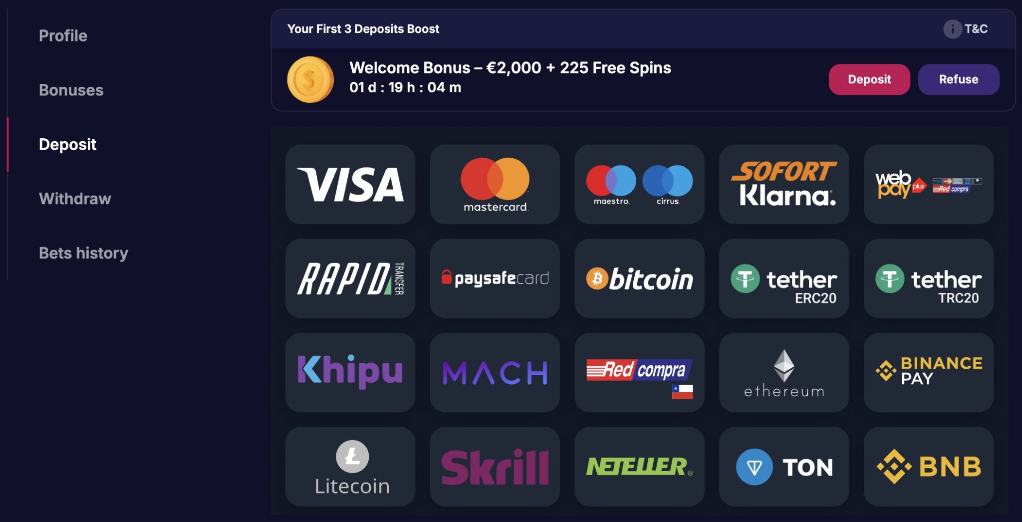 Om du gör din första insättning på 10 euro eller mer får du en 100 % spelbonus + 100 gratissnurr på Joker Stoker av Endorphina. Observera att spelbonustaket är 500 euro. När det gäller helt gratis rotationer får du 50 per dag i två dagar i rad.
